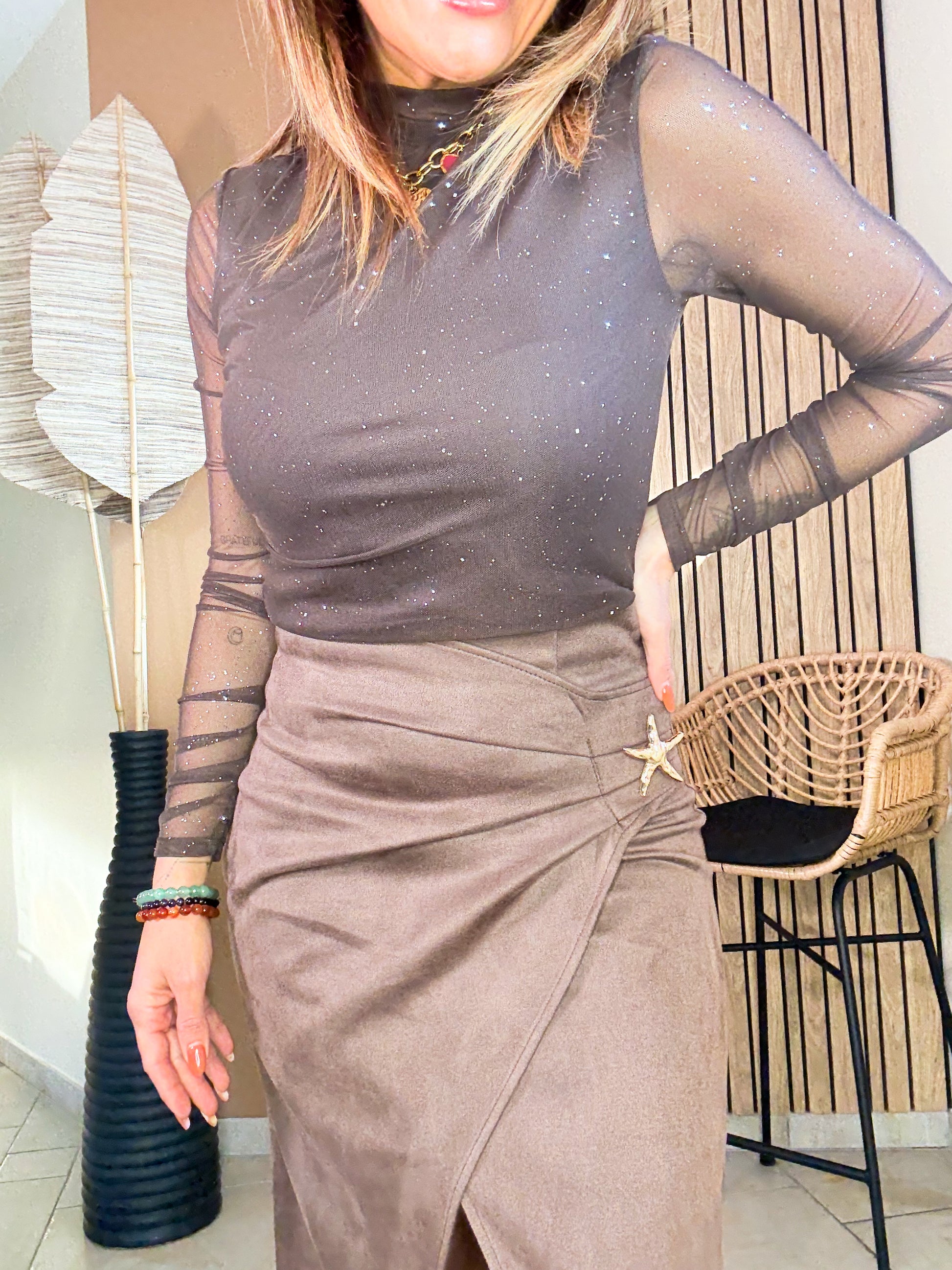 Élégante et ultra-féminine, la jupe Star Brown en suédine marron apporte une touche automnale irrésistible à votre silhouette 🍂✨